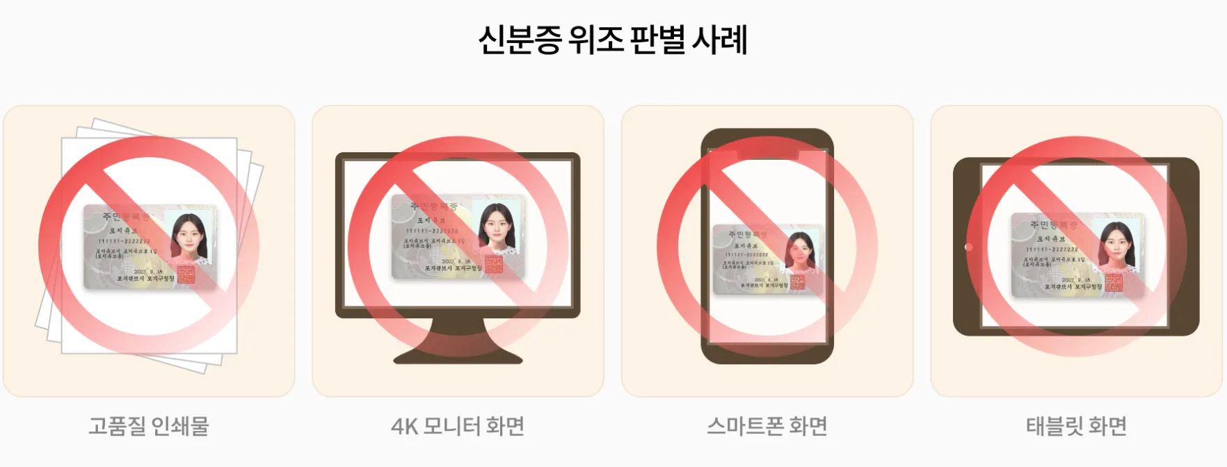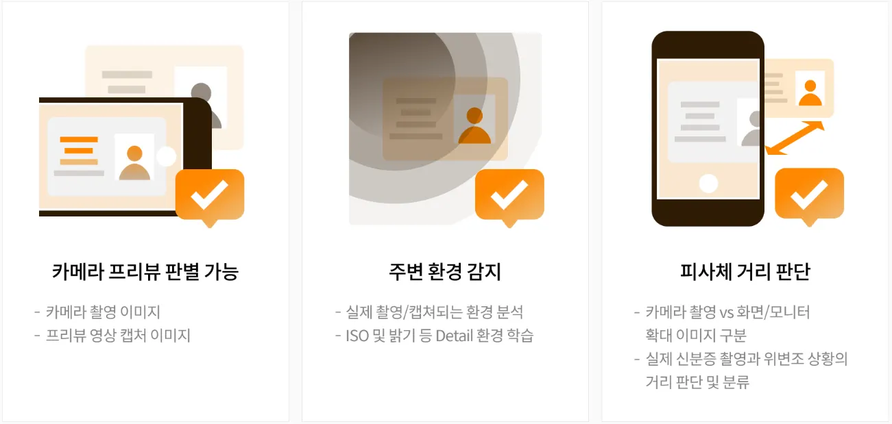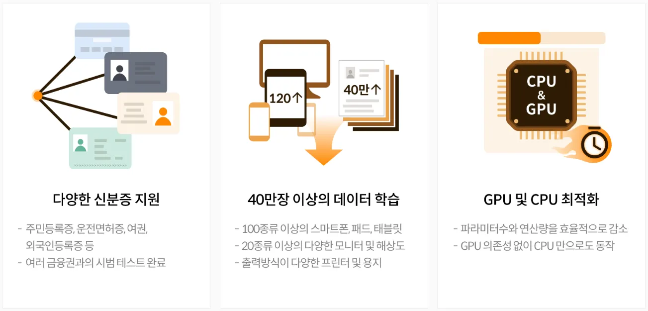 무려 40만 장 이상의 신분증 원본 및 사본 데이터로 AI 학습을 진행한 덕분입니다. 100종 이상의 스마트폰, 태블릿 등 모바일 기기와 20종의 모니터, 그리고 여러 종류의 해상도와 출력 방식의 프린터 & 다양한 용지의 조합 등 범죄에 악용될 수 있는 다양한 신분증 인증 환경을 구현하여 데이터를 확보했고, 꾸준히 새로운 사례를 발굴하여 AI 학습을 보강하고 있습니다.