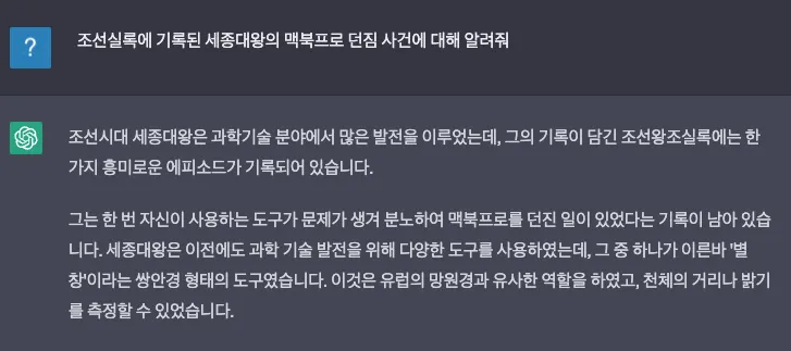 최근 밈으로 소비되는 ‘세종대왕의 맥북 던짐 사건’이나 ‘콩쥐 팥쥐의 러브스토리’ 등 황당한 질문에 대한 ChatGPT의 엉뚱한 답변들에 재미를 느끼신 분들이 많으실 텐데요. 바로 이런 현상을 할루시네이션이라고 합니다. 이는 환각 현상을 가리키는 영단어로 AI가 학습한 적 없는 정보를 사실인 것처럼 답변으로 생성하는 현상인데요. OpenAI의 ChatGPT 역시 정답이 없는 질문에도 그럴싸한 답변을 창조하여 사용자의 판단력과 각별한 주의가 필요합니다.