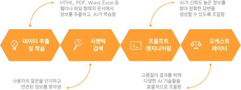 먼저, ‘데이터 추출 및 학습’을 통해 AI가 HTML, PDF, Word, Excel 등 웹과 파일 형태의 각종 기업 내부 문서에서 정보를 추출하고, 예상 질문과 답변을 연결하며 정보의 의미를 학습합니다. 이어서 사용자의 질문을 인지하고 연관된 정보를 찾아내는 ‘시맨틱 검색’과 그 질문에 대해 AI가 신뢰도 높은 정보를 찾도록 지시하는 ‘프롬프트 엔지니어링’을 통해 정확한 답변을 생성해냅니다. 또한, ‘오케스트레이터’를 통해 일련의 과정에서 복잡하게 작동하는 다양한 AI 기술들이 효율적으로 조율되어 높은 품질의 결과를 만들어 냅니다.