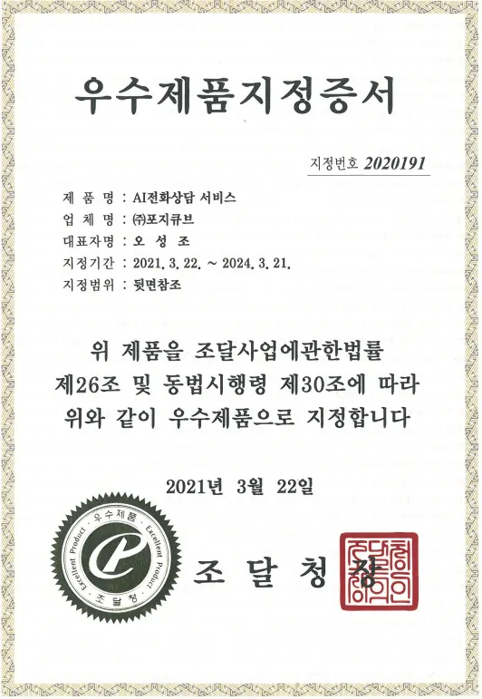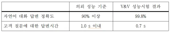 V&V성능시험 결과, 자연어 대화 답변 정확도 및 고객 질문에 대한 응답시간 2개의 시험항목에서 의뢰한 성능기준 이상을 달성함