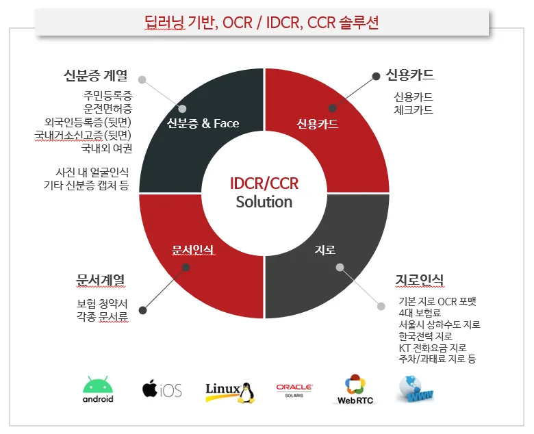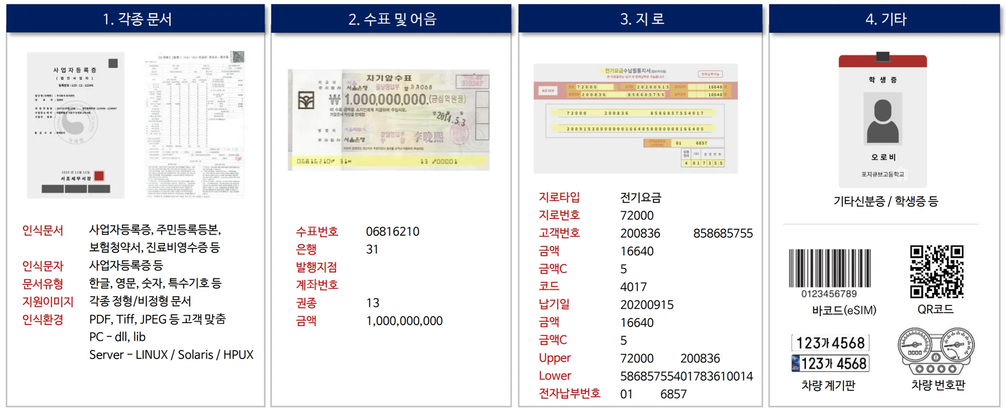 또한, 사업자등록증이나 진료비 영수증 등 각종 문서와 신용카드, 수표, 어음, 지로, 바코드, eSIM(이심), QR코드, 차량계기판, 차량 번호판 등 비정형화된 이미지 속 문자까지 정확한 인식률을 자랑합니다.
