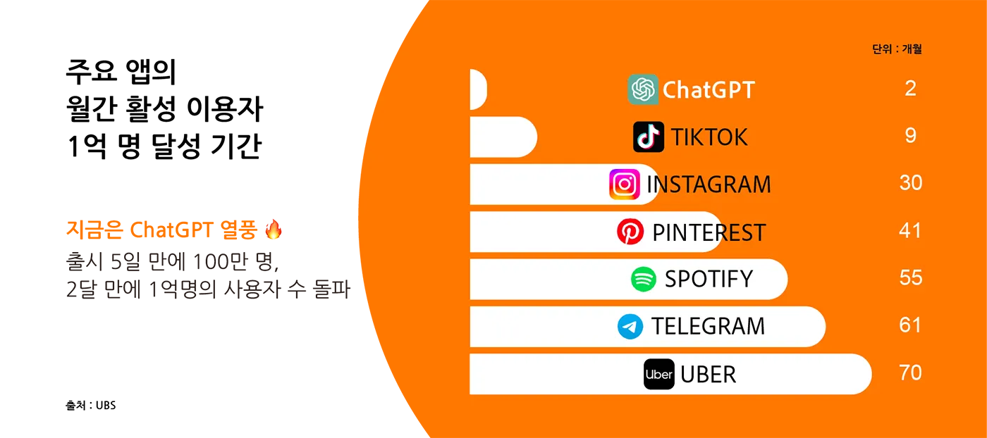 요즘 뉴스나 유튜브, 증권가 등 주변 어디에서나 가장 뜨거운 키워드 중 하나는 ‘ChatGPT’입니다. ChatGPT는 OpenAI가 개발한 대화형 인공지능 챗봇으로, 출시 5일 만에 100만 명, 두 달이 지나자 자그마치 1억 명의 월간 활성 이용자 수(MAU)를 기록했다고 하는데요. 이는 현대인의 필수 앱인 인스타그램이 30개월, 숏폼 문화의 중심 틱톡도 9개월이 걸려서야 달성한 수치입니다. 특히 빅테크 기업 중 하나인 마이크로소프트에서 10억 달러에 이어 올해 초 100억 달러를 연달아 투자했다는 소식까지 전해지고 있어 그야말로 ChatGPT의 인기가 하늘로 치솟고 있다고 할 수 있습니다.